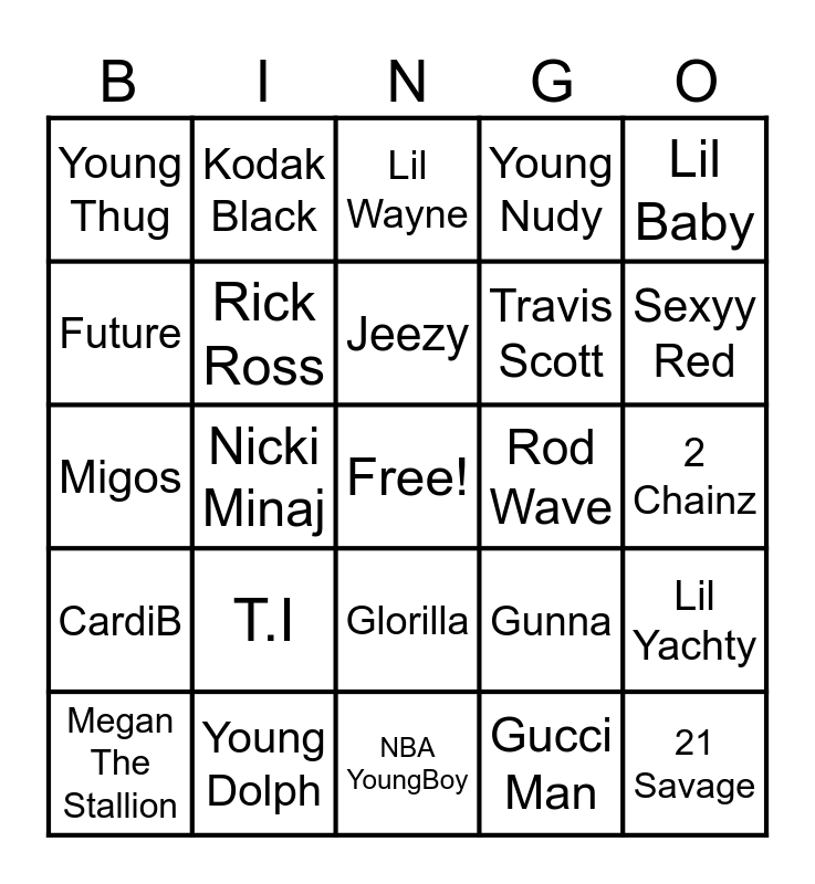 This bingo card has a free space and 24 words: Megan The Stallion, T.I, Jeezy, Gucci Man, Lil Baby, Young Thug, Kodak Black, Lil Wayne, Rod Wave, 2 Chainz, Migos, Rick Ross, Gunna, Lil Yachty, Future, Young Dolph, NBA YoungBoy, Young Nudy, Sexyy Red, CardiB, Nicki Minaj, Glorilla, Travis Scott and 21 Savage.