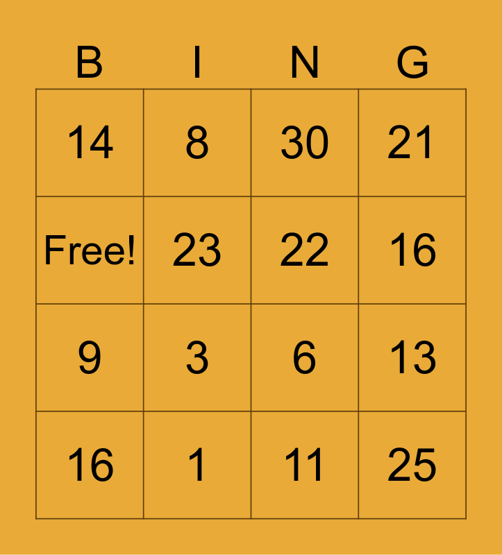 This bingo card has 16 words: 1, 13, 30, 14, 9, 8, 6, 11, Free!, 23, 16, 21, 3, 16, 22 and 25.