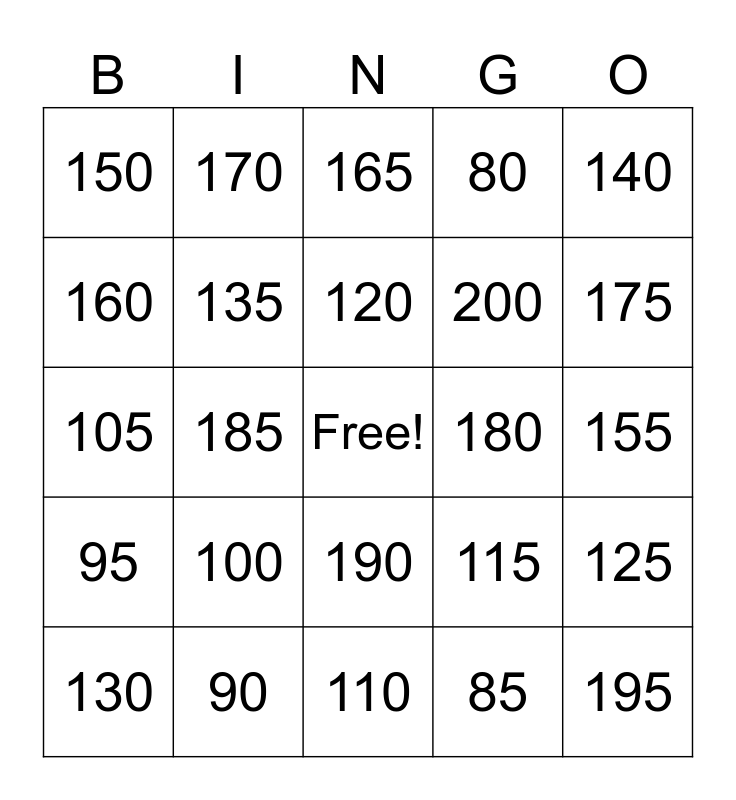 This bingo card has a free space and 25 words: 100, 110, 120, 130, 140, 150, 160, 170, 180, 190, 200, 105, 115, 125, 135, 145, 155, 165, 175, 185, 195, 90, 95, 80 and 85.