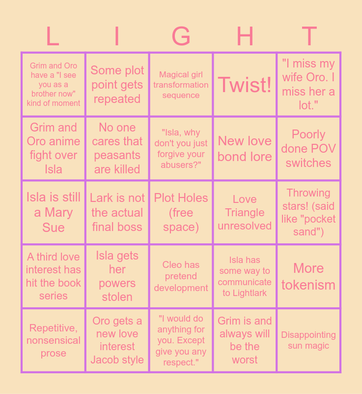 This bingo card has a free space and 29 words: Repetitive, nonsensical prose, Skyshade is barely different from Lightlark's world, Lark is not the actual final boss, Love triangle complicated, Grim and Oro have a "I see you as a brother now" kind of moment, Magical girl transformation sequence, No one cares that peasants are killed, Isla gets her powers stolen, Love Triangle unresolved, Oro gets a new love interest Jacob style, Throwing stars! (said like "pocket sand"), Disappointing sun magic, "I would do anything for you. Except give you any respect.", Grim is and always will be the worst, Poorly done POV switches, Dragons :), Cleo has pretend development, A third love interest has hit the book series, "I miss my wife Oro. I miss her a lot.", Isla is still a Mary Sue, Isla has some way to communicate to Lightlark, Genocide!!!!, New love bond lore, Grim and Oro anime fight over Isla, Twist!, Some plot point gets repeated, More tokenism, "Isla, why don't you just forgive your abusers?" and "I'm evil now!" (does nothing evil).