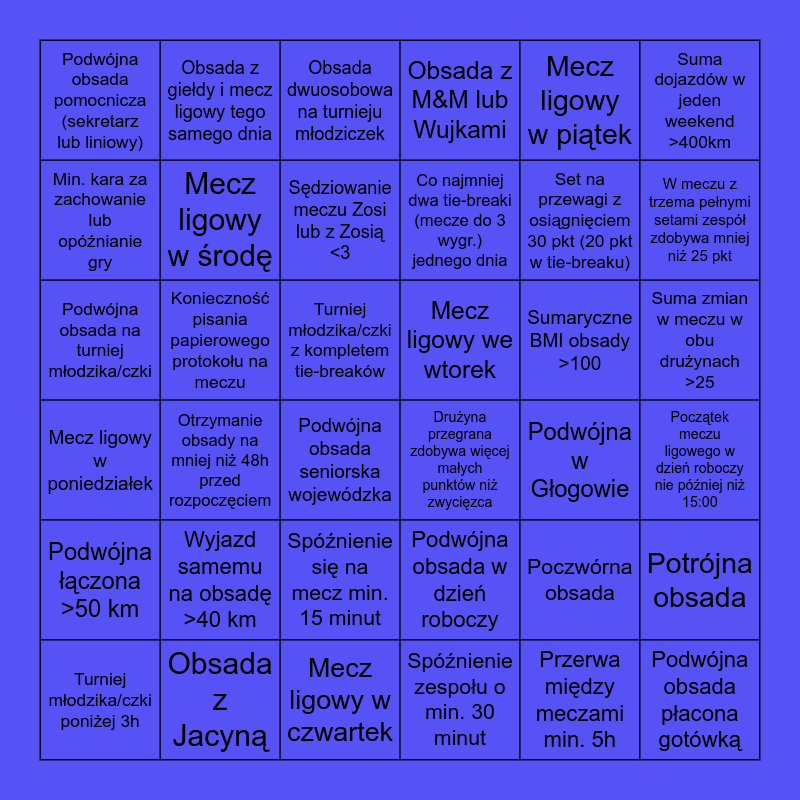 This bingo card has 36 words: Podwójna obsada w dzień roboczy, Spóźnienie się na mecz min. 15 minut, Spóźnienie zespołu o min. 30 minut, Min. kara za zachowanie lub opóźnianie gry, Mecz ligowy w poniedziałek, Mecz ligowy we wtorek, Mecz ligowy w środę, Mecz ligowy w czwartek, Mecz ligowy w piątek, Poczwórna obsada, W meczu z trzema pełnymi setami zespół zdobywa mniej niż 25 pkt, Obsada z M&M lub Wujkami, Potrójna obsada, Konieczność pisania papierowego protokołu na meczu, Co najmniej dwa tie-breaki (mecze do 3 wygr.) jednego dnia, Podwójna obsada pomocnicza (sekretarz lub liniowy), Podwójna łączona >50 km, Sumaryczne BMI obsady >100, Podwójna obsada na turniej młodzika/czki, Obsada dwuosobowa na turnieju młodziczek, Turniej młodzika/czki z kompletem tie-breaków, Otrzymanie obsady na mniej niż 48h przed rozpoczęciem, Drużyna przegrana zdobywa więcej małych punktów niż zwycięzca, Podwójna obsada seniorska wojewódzka, Podwójna w Głogowie, Obsada z giełdy i mecz ligowy tego samego dnia, Set na przewagi z osiągnięciem 30 pkt (20 pkt w tie-breaku), Obsada z Jacyną, Sędziowanie meczu Zosi lub z Zosią <3, Suma dojazdów w jeden weekend >400km, Podwójna obsada płacona gotówką, Turniej młodzika/czki poniżej 3h, Początek meczu ligowego w dzień roboczy nie później niż 15:00, Suma zmian w meczu w obu drużynach >25, Wyjazd samemu na obsadę >40 km and Przerwa między meczami min. 5h.