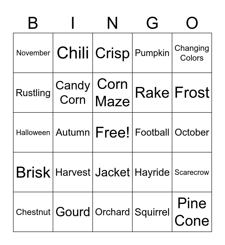 This bingo card has a free space and 33 words: Acorn, Apple, Autumn, Bonfire, Brisk, Candy Corn, Changing Colors, Chestnut, Chili, Cider, Corn Maze, Crisp, Fall, Foliage, Football, Frost, Gourd, Halloween, Harvest, Hayride, Jacket, Leaves, November, October, Orchard, Pine Cone, Pumpkin, Rake, Rustling, Scarecrow, School, Squirrel and Sweater.