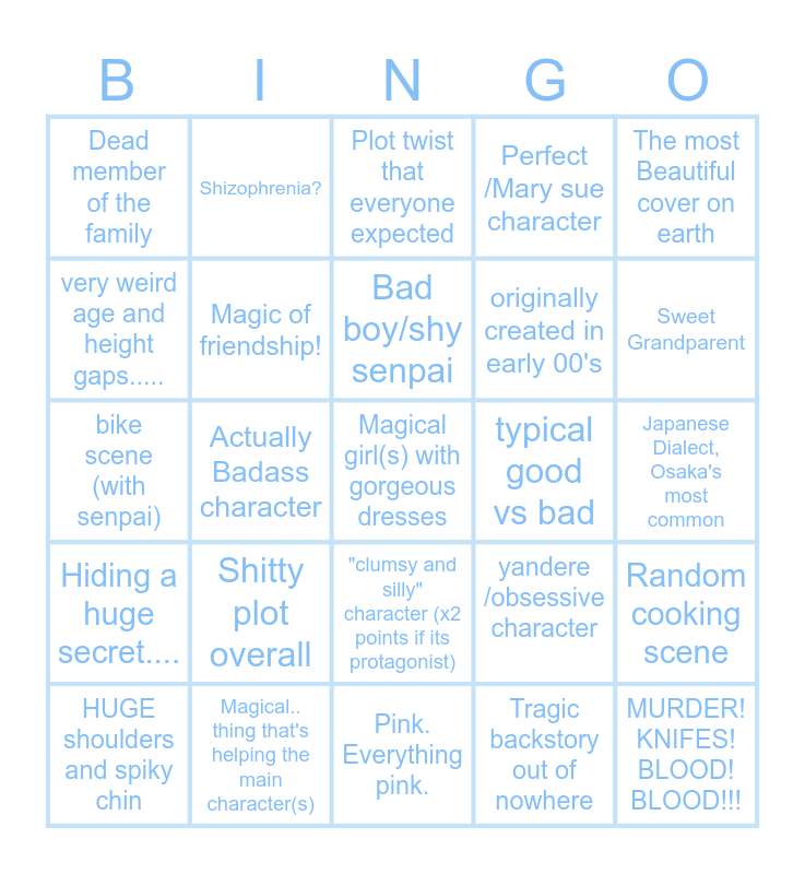 This bingo card has a free space and 24 words: Shitty plot overall, Magical.. thing that's helping the main character(s), Bad boy/shy senpai, HUGE shoulders and spiky chin, The most Beautiful cover on earth, Dead member of the family, very weird age and height gaps....., Shizophrenia?, typical good vs bad, "clumsy and silly" character (x2 points if its protagonist), originally created in early 00's, bike scene (with senpai), yandere /obsessive character, Random cooking scene, Magic of friendship!, Tragic backstory out of nowhere, Japanese Dialect, Osaka's most common, Plot twist that everyone expected, Sweet Grandparent, Actually Badass character, MURDER! KNIFES! BLOOD! BLOOD!!!, Hiding a huge secret...., Perfect /Mary sue character and Pink. Everything pink..