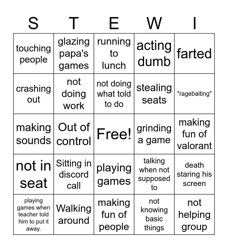 This bingo card has a free space and 24 words: Sitting in discord call, Walking around, not doing what told to do, playing games when teacher told him to put it away., farted, touching people, crashing out, glazing papa's games, grinding a game, playing games, stealing seats, making sounds, talking when not supposed to, death staring his screen, not doing work, not knowing basic things, making fun of valorant, running to lunch, "ragebaiting", Out of control, not helping group, not in seat, acting dumb and making fun of people.