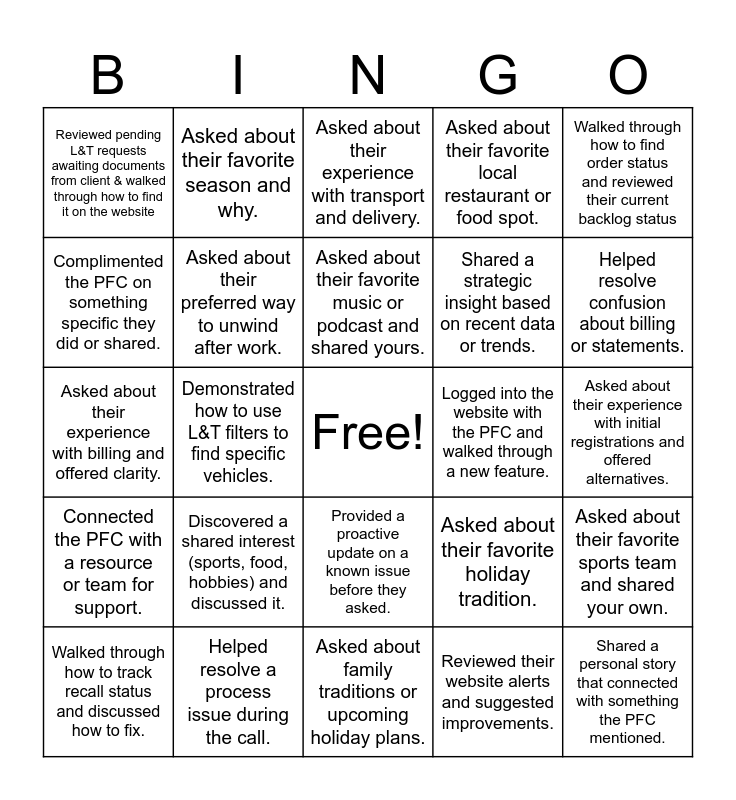 This bingo card has a free space and 47 words: Asked about a recent vacation and followed up with questions about favorite activities or local experiences., Shared a personal story that connected with something the PFC mentioned., Recalled a detail from a previous call and expanded on it., Asked about family traditions or upcoming holiday plans., Discovered a shared interest (sports, food, hobbies) and discussed it., Asked about a recent team event and what made it memorable., Asked about their favorite season and why., Asked about their weekend plans and followed up with a related suggestion., Complimented the PFC on something specific they did or shared., Asked about their favorite snack or drink during downtime., Asked about their preferred way to unwind after work., Asked about their favorite local restaurant or food spot., Asked about their favorite sports team and shared your own., Asked about their favorite holiday tradition., Asked about their work anniversary or tenure and celebrated it., Asked about their team culture or internal celebrations., Asked about their favorite music or podcast and shared yours., Logged into the website with the PFC and walked through a new feature., Showed the PFC how to use the backlog tool live during the call., Walked through how to find order status and reviewed their current backlog status, Demonstrated how to use L&T filters to find specific vehicles., Reviewed their website alerts and suggested improvements., Reviewed pending L&T requests awaiting documents from client & walked through how to find it on the website, Shared a strategic insight based on recent data or trends., Reviewed recent gains or credits and explained them clearly., Helped resolve confusion about billing or statements., Walked through how to track recall status and discussed how to fix., Reviewed registration processes and confirmed send-to rules., Provided a proactive update on a known issue before they asked., Connected the PFC with a resource or team for support., Reviewed recent delivery performance and discussed improvements., Asked about their experience with a recent change or rollout. i.e MMX, LA, etc, Asked “What can we do to make your job easier?” and documented the response., Identified a recurring pain point and offered a solution., Walked through a time-saving tip on the website., Helped resolve a process issue during the call., Asked about their experience with initial registrations and offered alternatives., Asked about their experience with maintenance or service delays., Asked about their experience with NSD or L&T and documented feedback., Asked about their preferred communication method and adjusted accordingly., Asked about their experience with driver setup or sub-accounts., Asked about their experience with transport and delivery., Asked about their experience with billing and offered clarity., Asked about their experience with recall tracking and offered a workaround., Asked about their experience with responsiveness and followed up., Asked “Is there anything else you need?” and followed up within 48 hours. and Sent a recap email after touch call.