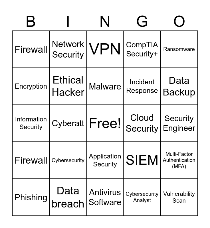This bingo card has a free space and 24 words: Cybersecurity, Data breach, Malware, Phishing, Ransomware, Firewall, Encryption, Network Security, Cloud Security, Application Security, Incident Response, Information Security, SIEM, Multi-Factor Authentication (MFA), Ethical Hacker, Cybersecurity Analyst, Security Engineer, VPN, Data Backup, Cyberatt, Vulnerability Scan, Firewall, CompTIA Security+ and Antivirus Software.