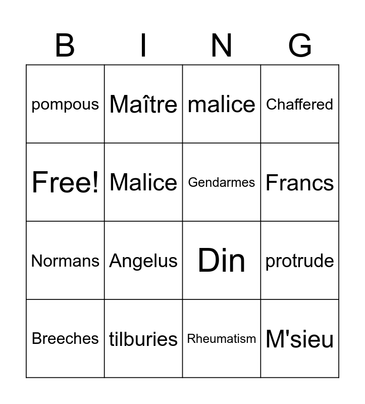 This bingo card has 16 words: tilburies, protrude, malice, pompous, Normans, Maître, Din, Rheumatism, Free!, Malice, Breeches, Chaffered, Angelus, Francs, Gendarmes and M'sieu.