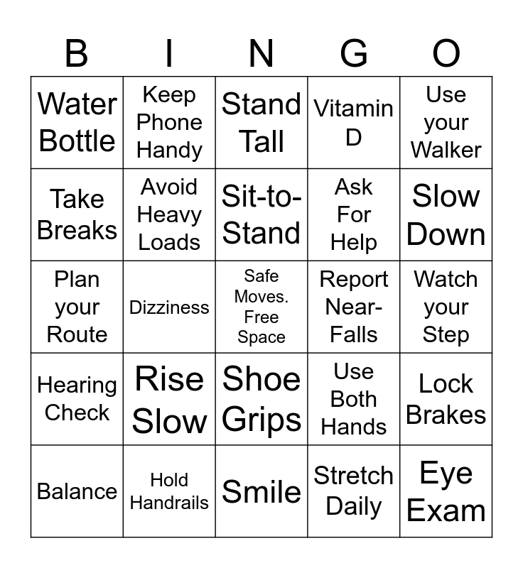 This bingo card has a free space and 24 words: Rise Slow, Hold Handrails, Sit-to-Stand, Balance, Use your Walker, Water Bottle, Take Breaks, Keep Phone Handy, Report Near- Falls, Shoe Grips, Ask For Help, Plan your Route, Use Both Hands, Lock Brakes, Avoid Heavy Loads, Stretch Daily, Watch your Step, Stand Tall, Slow Down, Dizziness, Eye Exam, Hearing Check, Vitamin D and Smile.