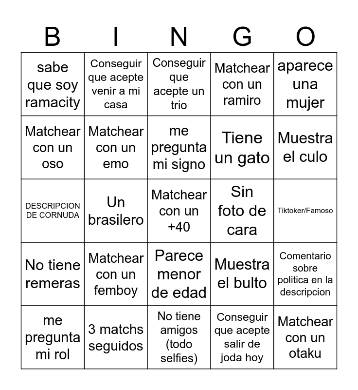 This bingo card has a free space and 24 words: Matchear con un femboy, 3 matchs seguidos, me pregunta mi signo, me pregunta mi rol, aparece una mujer, sabe que soy ramacity, Matchear con un oso, Conseguir que acepte venir a mi casa, Sin foto de cara, Parece menor de edad, Tiene un gato, DESCRIPCION DE CORNUDA, Muestra el bulto, Comentario sobre politica en la descripcion, Matchear con un emo, Conseguir que acepte salir de joda hoy, Tiktoker/Famoso, Conseguir que acepte un trio, Muestra el culo, Un brasilero, Matchear con un otaku, No tiene remeras, Matchear con un ramiro and No tiene amigos (todo selfies).