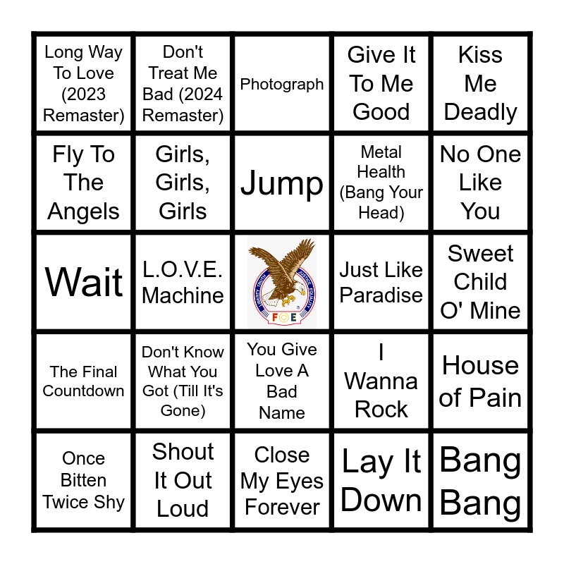 This bingo card has a free space and 51 words: (Can't Live Without Your) Love And Affection, Bang Bang, Cherry Pie (Sigue Sigue Sputnik Remix), Close My Eyes Forever, Don't Know What You Got (Till It's Gone), Don't Tread on Me, Don't Treat Me Bad (2024 Remaster), Edge Of A Broken Heart, Fly To The Angels, Get The Funk Out, Girls, Girls, Girls, Give It To Me Good, House of Pain, I Wanna Rock, I'll Wait - 2015 Remaster, Is This Love - 2018 Remaster, Jump, Just Like Paradise, Kickstart My Heart, Kiss Me Deadly, L.O.V.E. Machine, Lay It Down, Long Way To Love (2023 Remaster), Metal Health (Bang Your Head), Miles Away, Naughty Naughty, No One Like You, November Rain, Once Bitten Twice Shy, Photograph, Pour Some Sugar On Me, Rock Bottom, Rock Of Ages, Rock the Night, Set The Night On Fire, Shout It Out Loud, Smooth up in Ya, Soldiers Under Command, Something To Believe In - 2003 Remaster, Summertime Girls - Studio Version, Sweet Child O' Mine, The Final Countdown, To Be With You, Turn Up The Radio, Unskinny Bop, Up All Night, Wait, Wanted Dead Or Alive, We're Not Gonna Take It, You Give Love A Bad Name and You're Invited (But Your Friend Can't Come).
