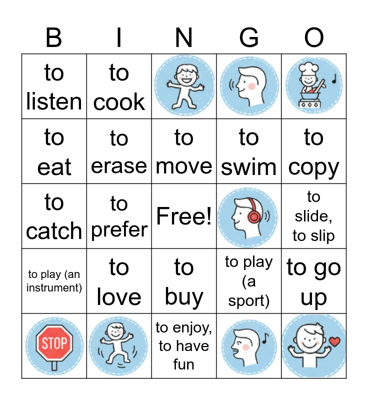 This bingo card has 12 images, a free space and 31 words: to buy, to love, to like, to enjoy, to have fun, to stop, to catch, to sing, to copy, to cook, to dance, to draw, to listen, to hit, to slide, to slip, to climb, to play, to play (a sport), to play (an instrument), to walk, to go up, to talk, to speak, to prefer, to jump, to touch, to work, to move, to eat, to swim, to announce, to erase and to throw.