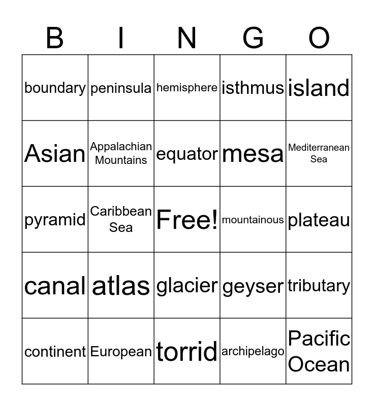 This bingo card has a free space and 25 words: atlas, torrid, equator, continent, island, boundary, Asian, peninsula, mountainous, glacier, mesa, pyramid, geyser, tributary, Appalachian Mountains, desert, plateau, hemisphere, Mediterranean Sea, Caribbean Sea, Pacific Ocean, European, canal, isthmus and archipelago.