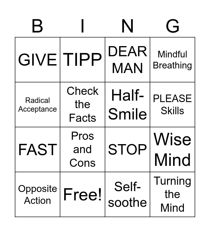 This bingo card has 16 words: Free!, Wise Mind, DEAR MAN, GIVE, FAST, TIPP, STOP, Self-soothe, Radical Acceptance, Check the Facts, Opposite Action, Mindful Breathing, Pros and Cons, PLEASE Skills, Half-Smile and Turning the Mind.