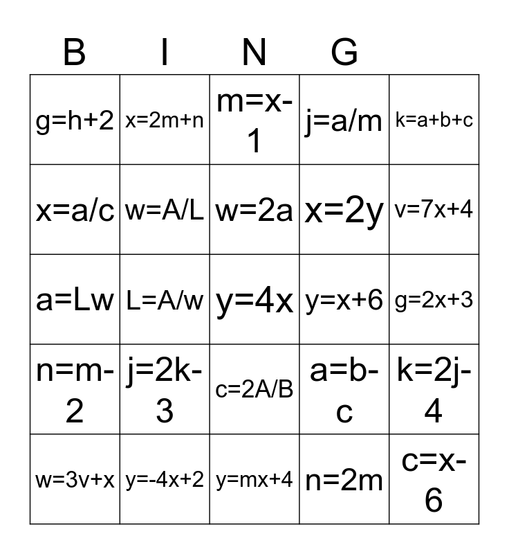 This bingo card has 30 words: y=-4x+2, y=4x+3, L=A/w, m=n-1, g=h+2, m=x-1, w=A/L, c=2A/B, y=x+6, y=mx+4, g=2x+3, y=4x, n=2m, c=x-6, v=7x+4, y=2x+1, a=b-c, n=m-2, j=2k-3, k=a+b+c, a=Lw, v=wx, x=2m+n, x=2y, x=a/c, j=a/m, k=2j-4, w=3v+x, w=2a and L=2m.