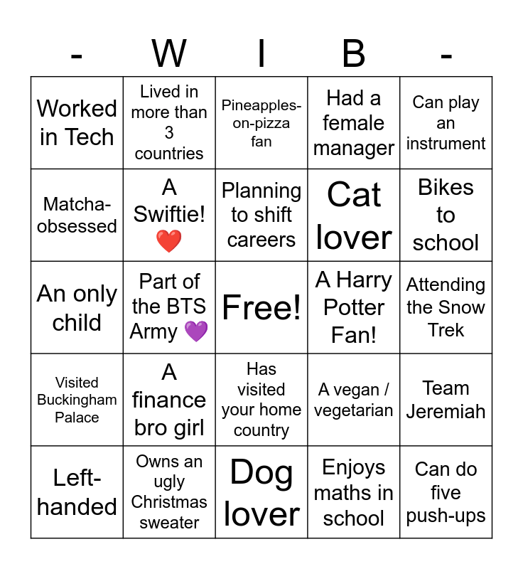 This bingo card has a free space and 39 words: Lives outside the LBS bubble, Same comfort food, Has watched a West End show, A Swiftie! ❤️, Left-handed, Has visited your home country, Planning to shift careers, Karaoke pro, Can play an instrument, Visited Buckingham Palace, Part of the BTS Army 💜, Had a female manager, Can do five push-ups, Attending the Snow Trek, A Harry Potter Fan!, A finance bro girl, Tea lover, Worked in Tech, Loves Olivia Dean, A vegan / vegetarian, Matcha-obsessed, Dog lover, Cat lover, Bikes to school, Takes the bus to school, Can cartwheel, Needs coffee to function, Has done at least 10 coffee chats, Multi-lingual queen (more than 3 languages), Lived in more than 3 countries, Pop pilates punk princess, Listened to a podcast this morning, Pineapples-on-pizza fan, Owns an ugly Christmas sweater, Enjoys maths in school, Team Conrad, Team Jeremiah, An only child and Worked in a team with at least 2 other girls.