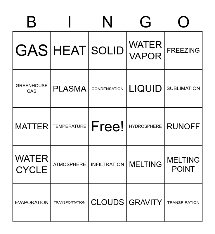 This bingo card has a free space and 25 words: ATMOSPHERE, CLOUDS, CONDENSATION, EVAPORATION, FREEZING, GAS, GREENHOUSE GAS, HEAT, HYDROSPHERE, INFILTRATION, LIQUID, MATTER, MELTING, MELTING POINT, PLASMA, PRECIPITATION, RUNOFF, SOLID, SUBLIMATION, TEMPERATURE, TRANSPIRATION, TRANSPORTATION, WATER CYCLE, WATER VAPOR and GRAVITY.