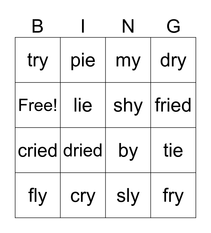 This bingo card has 16 words: cry, tie, my, try, cried, pie, by, sly, Free!, lie, fly, dry, dried, fried, shy and fry.