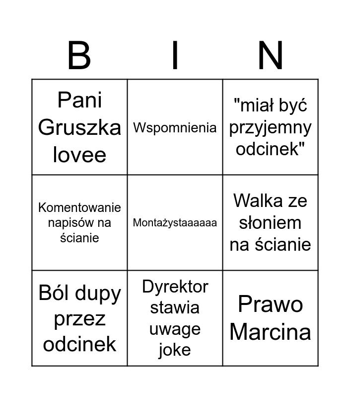 This bingo card has 9 words: Ból dupy przez odcinek, "miał być przyjemny odcinek", Wspomnienia, Komentowanie napisów na ścianie, Pani Gruszka lovee, Walka ze słoniem na ścianie, Montażystaaaaaa, Prawo Marcina and Dyrektor stawia uwage joke.