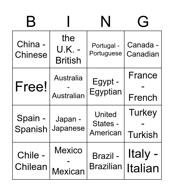 This bingo card has 16 words: Mexico - Mexican, Turkey - Turkish, Portugal - Portuguese, China - Chinese, Spain - Spanish, the U.K. - British, United States - American, Brazil - Brazilian, Free!, Australia - Australian, Chile - Chilean, Canada - Canadian, Japan - Japanese, France - French, Egypt - Egyptian and Italy - Italian.