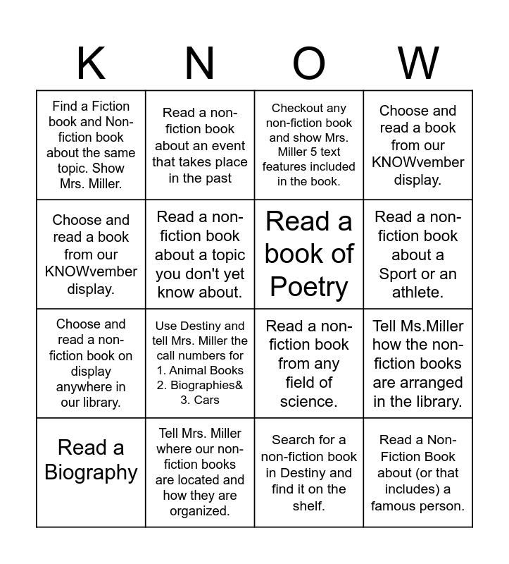 This bingo card has 16 words: Read a Biography, Tell Mrs. Miller where our non-fiction books are located and how they are organized., Checkout any non-fiction book and show Mrs. Miller 5 text features included in the book., Choose and read a book from our KNOWvember display., Choose and read a book from our KNOWvember display., Read a non-fiction book about an event that takes place in the past, Read a non-fiction book from any field of science., Tell Ms.Miller how the non-fiction books are arranged in the library., Find a Fiction book and Non-fiction book about the same topic. Show Mrs. Miller., Read a non-fiction book about a topic you don't yet know about., Search for a non-fiction book in Destiny and find it on the shelf., Read a non-fiction book about a Sport or an athlete., Choose and read a non-fiction book on display anywhere in our library., Use Destiny and tell Mrs. Miller the call numbers for 1. Animal Books 2. Biographies& 3. Cars, Read a book of Poetry and Read a Non-Fiction Book about (or that includes) a famous person..
