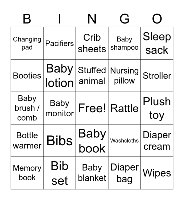 This bingo card has a free space and 50 words: Diapers, Wipes, Onesies, Baby blanket, Bibs, Burp cloths, Pacifiers, Bottles, Booties, Baby hat, Baby lotion, Baby shampoo, Diaper cream, Washcloths, Hooded towel, Teething toy, Stuffed animal, Rattle, Swaddle, Sleep sack, Baby monitor, Diaper bag, Changing pad, Nursing pillow, Baby carrier, High chair, Stroller, Car seat, Crib sheets, Baby book, Board books, Baby bath tub, Nail clippers, Thermometer, Bib set, Milestone cards, Baby food set / utensils, Gift card, Picture frame, Plush toy, Baby socks, Baby outfit, Nightlight, Mobile (crib mobile), Memory book, Baby brush / comb, Hand sanitizer, Burp cloths, Bottle warmer and White noise machine.