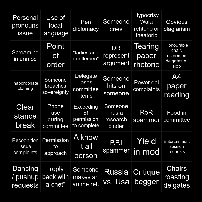 This bingo card has 36 words: P.P.I spammer, A know it all person, Russia vs. Usa, Screaming in unmod, Clear stance break, Someone hits on someone, Point of order, Someone makes an anime ref., Hypocrisy Wala rehtoric or theatoric, Yield in mod, Honourable chair, esteemed delgates AI slop, Someone cries, Entertainment session requests, Someone breaches sovereignty, DR represent argument, Personal pronouns issue, Recognition issue complaints, Power del complaints, Inappropriate clothing, Pen diplomacy, Delegate loses committee items, Phone use during committee, Someone has a research binder, Exceeding of permission to complete, RoR spammer, Use of local language, Tearing paper rhetoric, "reply back with a chet", "ladies and gentlemen", Obvious plagiarism, Chairs roasting delgates, Dancing / pushup requests, Food in committee, A4 paper reading, Permission to approach and Critique begger.