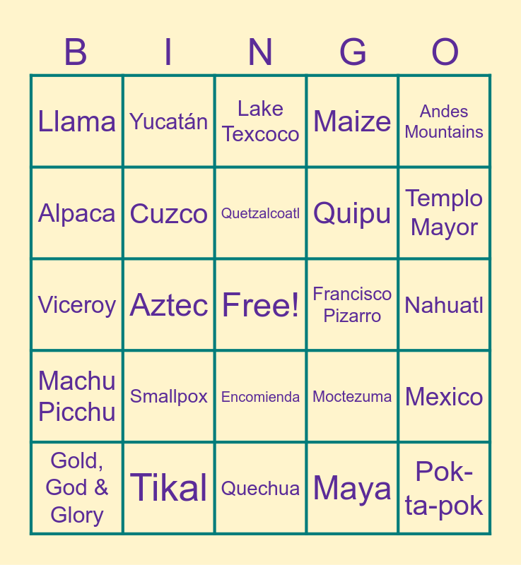 This bingo card has a free space and 32 words: Maya, Inca, Aztec, Tenochtitlán, Machu Picchu, Cuzco, Andes Mountains, Mexico, Yucatán, Chichén Itzá, Quetzalcoatl, Lake Texcoco, chinampas, Hernán Cortés, Francisco Pizarro, Vasco Núñez de Balboa, Gold, God & Glory, Viceroy, Encomienda, Smallpox, Moctezuma, Eagle on cactus, Nahuatl, Tikal, Pok-ta-pok, Maize, Quipu, Alpaca, Llama, Quechua, Atahualpa and Templo Mayor.