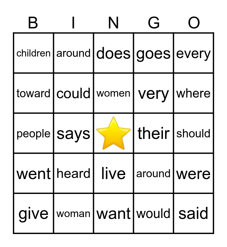 This bingo card has a free space and 24 words: heard, woman, women, give, every, children, toward, around, their, live, very, people, around, were, could, would, should, does, where, says, said, went, goes and want.
