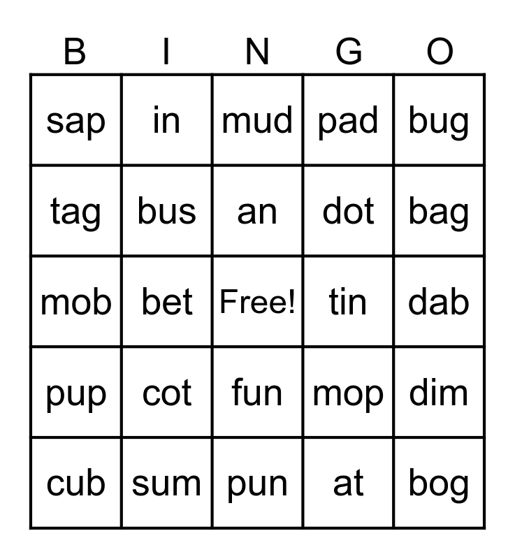 This bingo card has a free space and 24 words: cot, sum, an, cub, bug, sap, tag, in, tin, fun, dot, mob, mop, dim, bus, at, dab, mud, bag, bet, bog, pup, pad and pun.
