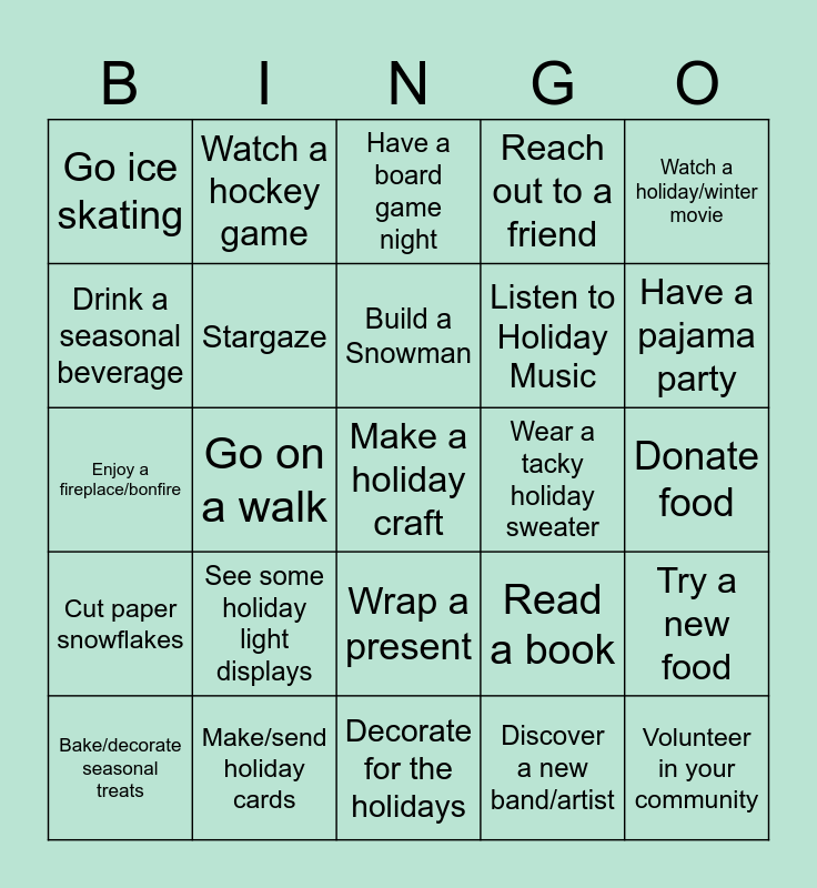 This bingo card has 25 words: See some holiday light displays, Decorate for the holidays, Build a Snowman, Bake/decorate seasonal treats, Watch a holiday/winter movie, Go ice skating, Drink a seasonal beverage, Watch a hockey game, Wear a tacky holiday sweater, Wrap a present, Listen to Holiday Music, Enjoy a fireplace/bonfire, Read a book, Try a new food, Stargaze, Volunteer in your community, Donate food, Have a board game night, Have a pajama party, Go on a walk, Make a holiday craft, Make/send holiday cards, Cut paper snowflakes, Reach out to a friend and Discover a new band/artist.