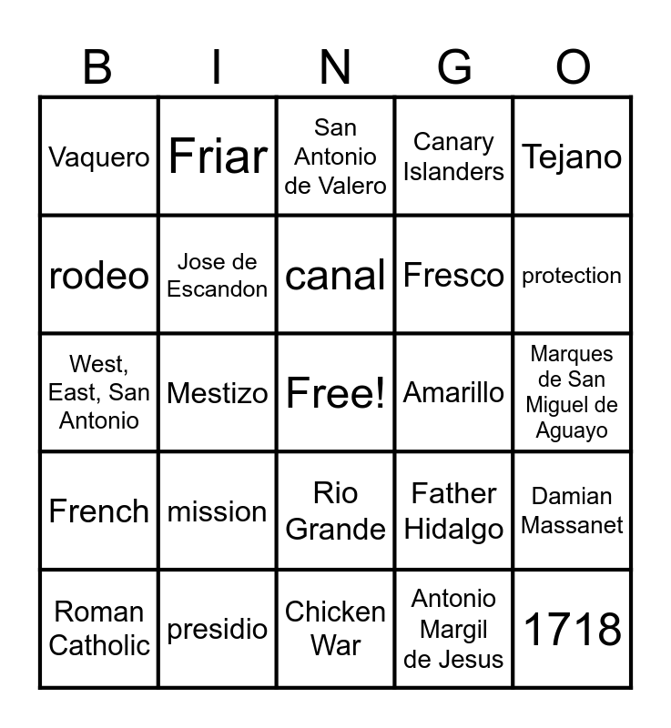 This bingo card has a free space and 24 words: mission, presidio, canal, Roman Catholic, Tejano, Vaquero, rodeo, Friar, Amarillo, Rio Grande, Fresco, West, East, San Antonio, Father Hidalgo, Damian Massanet, Jose de Escandon, Antonio Margil de Jesus, Marques de San Miguel de Aguayo, San Antonio de Valero, protection, Mestizo, 1718, French, Canary Islanders and Chicken War.