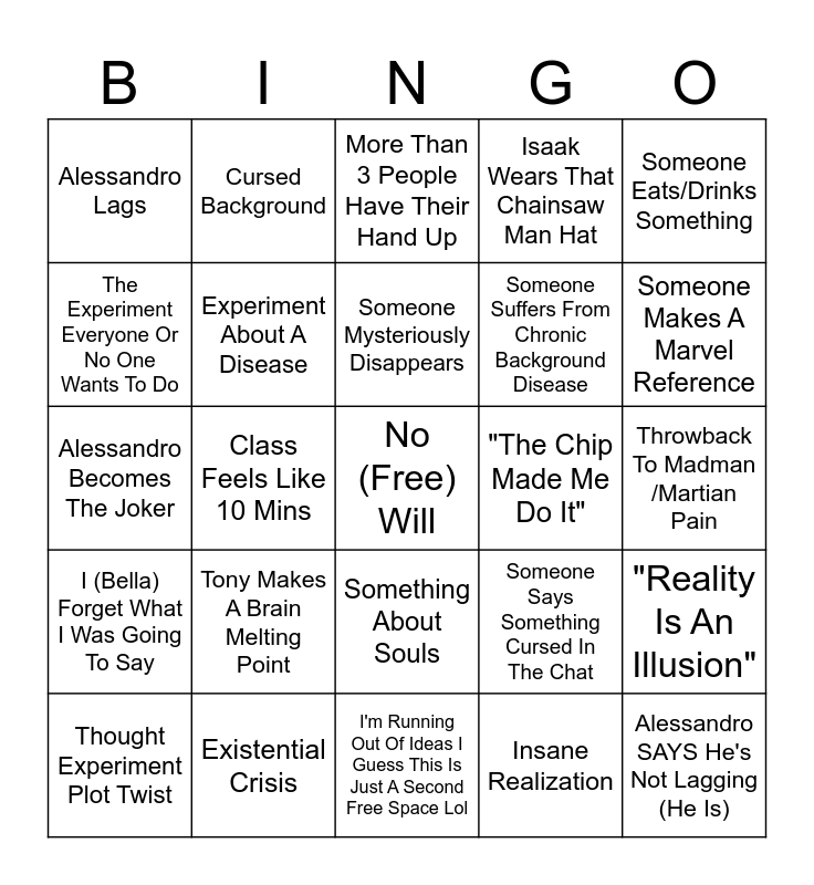 This bingo card has a free space and 24 words: Tony Makes A Brain Melting Point, Existential Crisis, Someone Mysteriously Disappears, Thought Experiment Plot Twist, Someone Eats/Drinks Something, Alessandro Lags, The Experiment Everyone Or No One Wants To Do, Cursed Background, "The Chip Made Me Do It", Something About Souls, Someone Suffers From Chronic Background Disease, Alessandro Becomes The Joker, Someone Says Something Cursed In The Chat, "Reality Is An Illusion", Experiment About A Disease, Insane Realization, Throwback To Madman /Martian Pain, More Than 3 People Have Their Hand Up, Someone Makes A Marvel Reference, Class Feels Like 10 Mins, Alessandro SAYS He's Not Lagging (He Is), I (Bella) Forget What I Was Going To Say, Isaak Wears That Chainsaw Man Hat and I'm Running Out Of Ideas I Guess This Is Just A Second Free Space Lol.