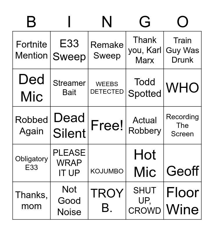 This bingo card has a free space and 24 words: PLEASE WRAP IT UP, Not Good Noise, WEEBS DETECTED, Thanks, mom, Train Guy Was Drunk, Fortnite Mention, Ded Mic, E33 Sweep, Actual Robbery, KOJUMBO, Todd Spotted, Robbed Again, Hot Mic, Geoff, Streamer Bait, SHUT UP, CROWD, Recording The Screen, Remake Sweep, WHO, Dead Silent, Floor Wine, Obligatory E33, Thank you, Karl Marx and TROY B..