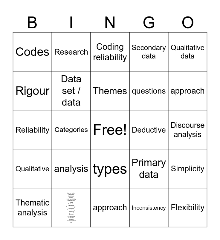 This bingo card has a free space and 30 words: A priori codes Categories Code book Codes Coding reliability Data set / data types Deductive approach Discourse analysis Flexibility Inconsistency Inductive approach Patterns Primary data Qualitative analysis Qualitative data Rel, A priori codes, Categories, Code book, Codes, Coding reliability, Data set / data, types, Deductive, approach, Discourse analysis, Flexibility, Inconsistency, Inductive, approach, Patterns, Primary data, Qualitative, analysis, Qualitative data, Reliability, Research aims, Research, questions, Rigour, Secondary data, Simplicity, Thematic analysis, Themes and Vagueness.