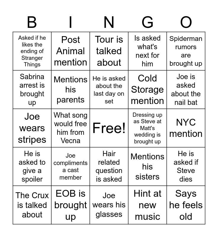 This bingo card has a free space and 24 words: Joe compliments a cast member, EOB is brought up, He is asked about the last day on set, The Crux is talked about, Spiderman rumors are brought up, Asked if he likes the ending of Stranger Things, Sabrina arrest is brought up, Post Animal mention, Dressing up as Steve at Matt's wedding is brought up, Hair related question is asked, Cold Storage mention, Joe wears stripes, Mentions his sisters, He is asked if Steve dies, Mentions his parents, Hint at new music, NYC mention, Tour is talked about, Joe is asked about the nail bat, What song would free him from Vecna, Says he feels old, He is asked to give a spoiler, Is asked what's next for him and Joe wears his glasses.