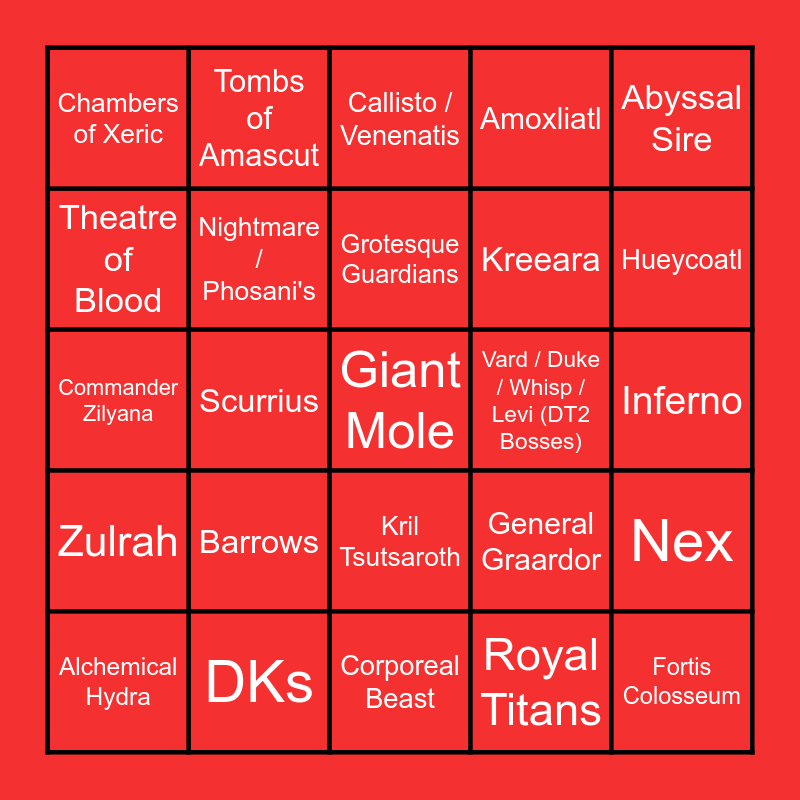 This bingo card has 25 words: Barrows, Corporeal Beast, Grotesque Guardians, Alchemical Hydra, Abyssal Sire, Chambers of Xeric, Theatre of Blood, Tombs of Amascut, Vard / Duke / Whisp / Levi (DT2 Bosses), Kril Tsutsaroth, Kreeara, Commander Zilyana, General Graardor, Nex, Nightmare / Phosani's, Fortis Colosseum, Inferno, Callisto / Venenatis, Hueycoatl, Scurrius, Giant Mole, DKs, Zulrah, Amoxliatl and Royal Titans.