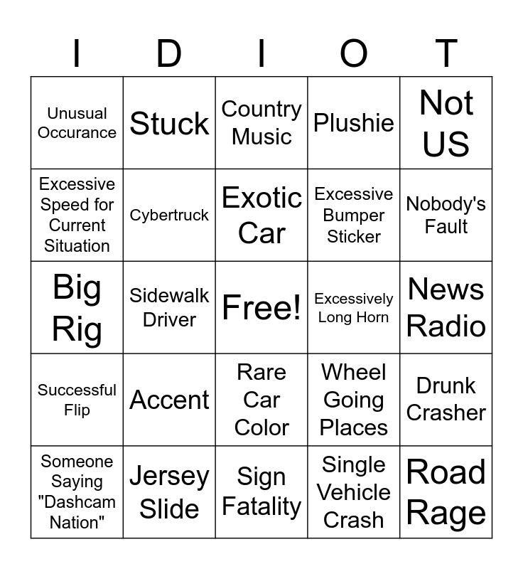 This bingo card has a free space and 80 words: Funny Number, Secret Third Lane, Country Music, Rap Music, A bad driver never misses their exit, Parking Lot Crash, How did they get there?, Vandalism by Car, NPC Bystander, Cop Saves the Day, Animal, Dashboard Item, Plushie, Unusual Occurance, Ohio Roads, Excessive Speed for Current Situation, Pennsylvania Driver, Accent, Man Cursing, News Radio, Hit and Run, Not US, Big Rig, Exotic Car, Cybertruck, Pickup with Bright Lights, Cammer Crash, Garmin Logo, Jumpscare, Backing Up Crash, Nobody's Fault, Tree Fatality, Sign Fatality, Totaled Vehicle, Someone Saying "Dashcam Nation", Excessively Long Horn, Multiple Bad Drivers, Red Light Suggestion, Stepped Out of Vehicle, Road Rage, Close Call, Can Opener, Purposeful Crash, Wrong Way Driver, Tokyo Drifting, Stuck, Flipped Vehicle, Kid Crying, Pole Destruction, Not a Dashcam, Drunk Crasher, Sidewalk Driver, Wheel Going Places, Cab Camera, "Okay Garmin", Scream of Terror, Extremely Loud Music, Double Yellow Lines, Lit Cigarette, Rare Car Color, Excessive Bumper Sticker, Wrapped Car Design, U-Haul Truck, Stunting Gone Wring, Biker's Fault, Motorcycle Crash, Timestamp for more than a year ago, Funny Username, Bird, Karen, Successful Flip, Jersey Slide, Water Crash, Vehicle Airborne, Unsafe Load, Baby on Board, Single Vehicle Crash, Slowmo, Middle Finger and 2am - 4am.