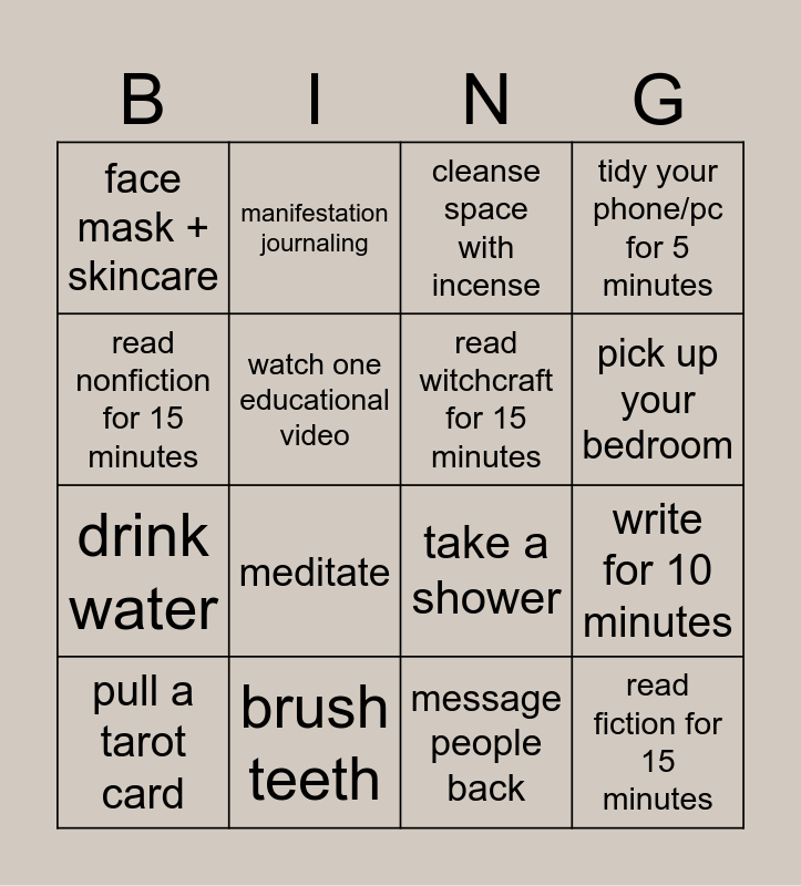 This bingo card has 20 words: write for 10 minutes, workout, cleanse space with incense, fold clothing for 5 minutes, pull a tarot card, read nonfiction for 15 minutes, brush teeth, face mask + skincare, drink water, manifestation journaling, meditate, take a shower, watch one educational video, read fiction for 15 minutes, read witchcraft for 15 minutes, ground yourself outside, pick up your bedroom, tidy your phone/pc for 5 minutes, message people back and do one house chore.