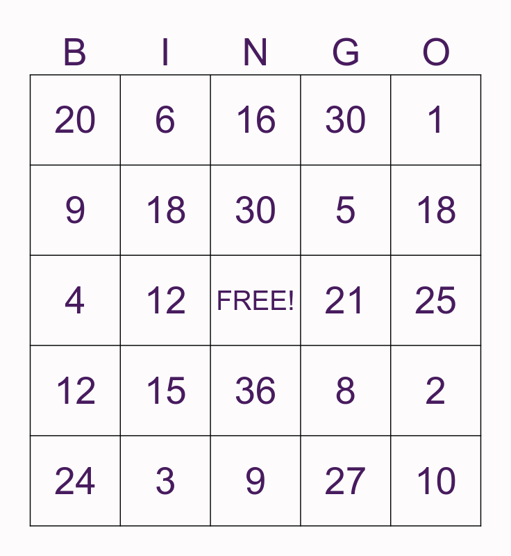 This bingo card has a free space and 24 words: 15, 3, 30, 24, 1, 20, 9, 6, 21, 36, 5, 4, 8, 2, 18, 27, 25, 16, 18, 12, 10, 12, 30 and 9.