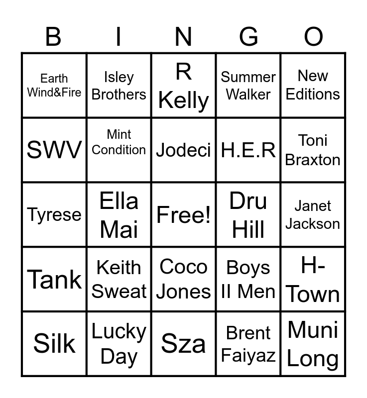 This bingo card has a free space and 24 words: Silk, Keith Sweat, Jodeci, Brent Faiyaz, New Editions, Earth Wind&Fire, Isley Brothers, R Kelly, Dru Hill, Janet Jackson, Tyrese, Mint Condition, Boys II Men, H-Town, SWV, Lucky Day, Sza, Summer Walker, Toni Braxton, Tank, Ella Mai, Coco Jones, H.E.R and Muni Long.
