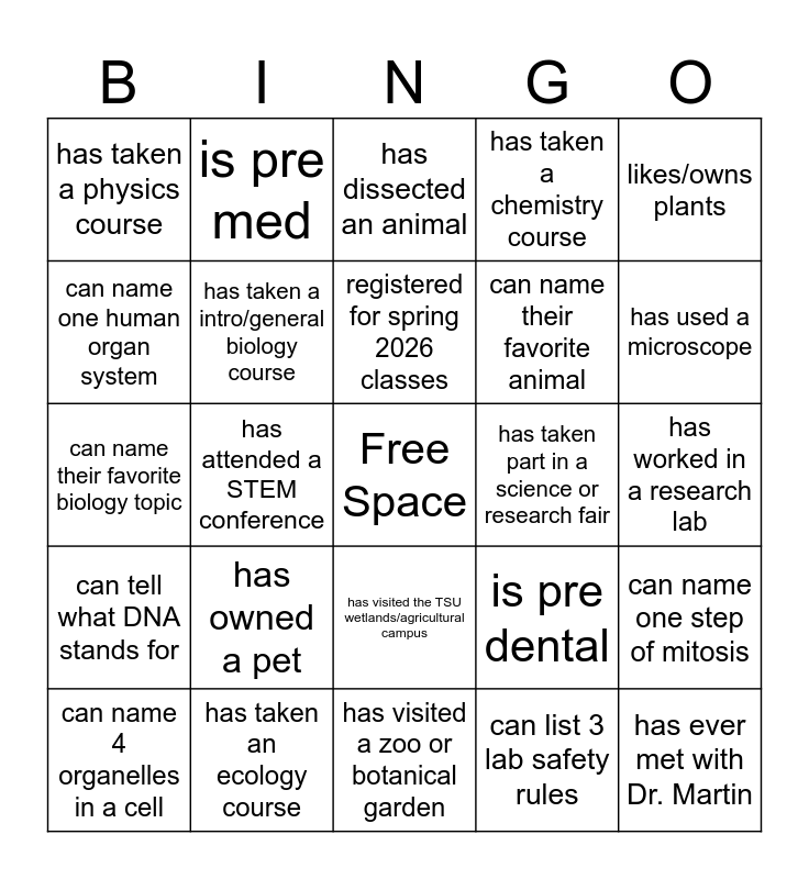 This bingo card has a free space and 24 words: can name 4 organelles in a cell, has owned a pet, registered for spring 2026 classes, can list 3 lab safety rules, likes/owns plants, has taken a physics course, is pre med, has dissected an animal, has taken part in a science or research fair, has worked in a research lab, can name their favorite biology topic, has taken a intro/general biology course, is pre dental, can name one step of mitosis, can name one human organ system, has taken an ecology course, has visited a zoo or botanical garden, has taken a chemistry course, has used a microscope, can tell what DNA stands for, has attended a STEM conference, has visited the TSU wetlands/agricultural campus, can name their favorite animal and has ever met with Dr. Martin.