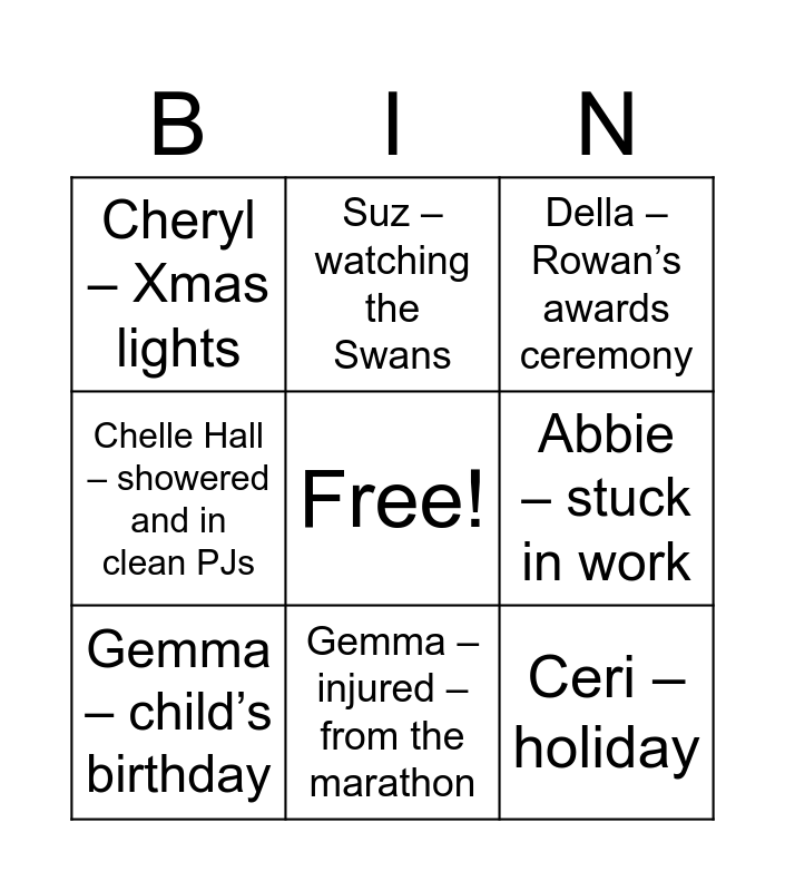 This bingo card has a free space and 57 words: Aisling – Having her eyebrows done, Gill – School concert, Jo M – School concert, Cheryl – Xmas lights, Leigh – Football party, Amber – wrong time, Gemma – child’s birthday, Chelle Hall – fractured rib, Amber – mother in law, Gemma – emptying her child’s bedroom, Chelle Hall – showered and in clean PJs, Kim – resting her foot, Jen – nails and hair done, Sarah – didn’t want to bring Noah out in the rain, Suz – holiday, Chelle Hall – holiday, Ceri – holiday, Cheryl – having her eyelashes done, Gemma – having her hair done, Sarah – in ‘healing mode’, Jo M – not well, Gemma – niece had prom, Abbie – Efas leaving party, Della – Rowan’s awards ceremony, Julie D – no reason given, Gemma – injured – from the marathon, Ceri – stuck in traffic, Suz – rough from Benidorm, Kim – not feeling well, Della – late leaving work, Julie D – on holiday, Abbie – feeling rough, Aisling – had a cold, Ceri – holiday, Suz – baking, Abbie – stuck in work, Jen – volunteering at Beavers, Leigh – date night, Jen – pumpkin hunt, Ashleigh – watching the Swans, Suz – watching the Swans, Kim – working late to finish early another day to have her hair done, Suz – first aid course, Della – first aid course, Danielle – first aid course, Jo M – first aid course, Gemma – down the caravan, Hannah B – working, Aisling – organising for tour, Kim – Nan stuck on a stairlift, Aisling – fell asleep, Jen – stuck in traffic, Emily – meal with work, Della – Netball, Sarah – waiting for a vet, Hannah H – fireworks and Suz – fireworks.
