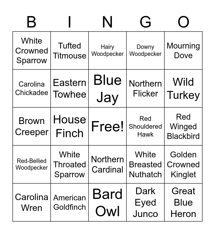 This bingo card has a free space and 26 words: Northern Cardinal, Dark Eyed Junco, Blue Jay, American Goldfinch, Mourning Dove, White Crowned Sparrow, Carolina Chickadee, Tufted Titmouse, Red Winged Blackbird, White Breasted Nuthatch, Northern Flicker, Brown Creeper, Golden Crowned Kinglet, Carolina Wren, House Finch, Yellow-Bellied Sapsucker, Downy Woodpecker, Red-Bellied Woodpecker, Hairy Woodpecker, Great Blue Heron, Wild Turkey, Bard Owl, Red Shouldered Hawk, White Throated Sparrow, Eastern Towhee and Great Horned Owl.
