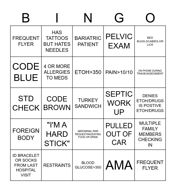 This bingo card has a free space and 24 words: "I'M A HARD STICK", RESTRAINTS, ETOH>350, ID BRACELET OR SOCKS FROM LAST HOSPITAL VISIT, BED BUGS,SCABIES,OR LICE, FREQUENT FLYER, CODE BLUE, HAS TATTOOS BUT HATES NEEDLES, SEPTIC WORK UP, ABDOMINAL PAIN REQUESTING/EATING FOOD OR DRINK, PAIN>10/10, STD CHECK, PULLED OUT OF CAR, MULTIPLE FAMILY MEMBERS CHECKING IN, 4 OR MORE ALLERGIES TO MEDS, AMA, DENIES ETOH/DRUGS IS POSTIVE ETOH/DRUGS, BARIATRIC PATIENT, ON PHONE DURING TRIAGE/ASSESSMENT, CODE BROWN, FREQUENT FLYER, FOREIGN BODY, PELVIC EXAM and BLOOD GLUCOSE>350.