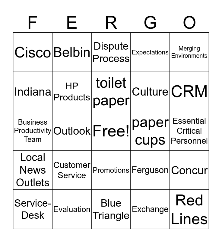 This bingo card has a free space and 52 words: Experts, Red Lines, Transparent Lines, Blue Triangle, Customer Service, Roll-Through Calendar, Belbin, Reimage, Indiana, Illinois, HP Products, Expense Wire, Concur, Ferguson, Acquired Branches, PCS Industries, toilet paper, paper cups, CMRO, Merging Environments, Outlook, Exchange, Cisco, Culture, Team Work, San Antonio, Corporate, Install, CRM, Support Operations, Quality Assurance, Expectations, Training Development, Liaison, Chat, Dispute Process, Evaluation, BIOS, Perk Points, Inclement Weather, Safety, Essential Critical Personnel, Local News Outlets, Never Closed, Promotions, New Hires, Help-Desk, Business Productivity Team, Engaged, IT Connect, Service-Desk and Travel.
