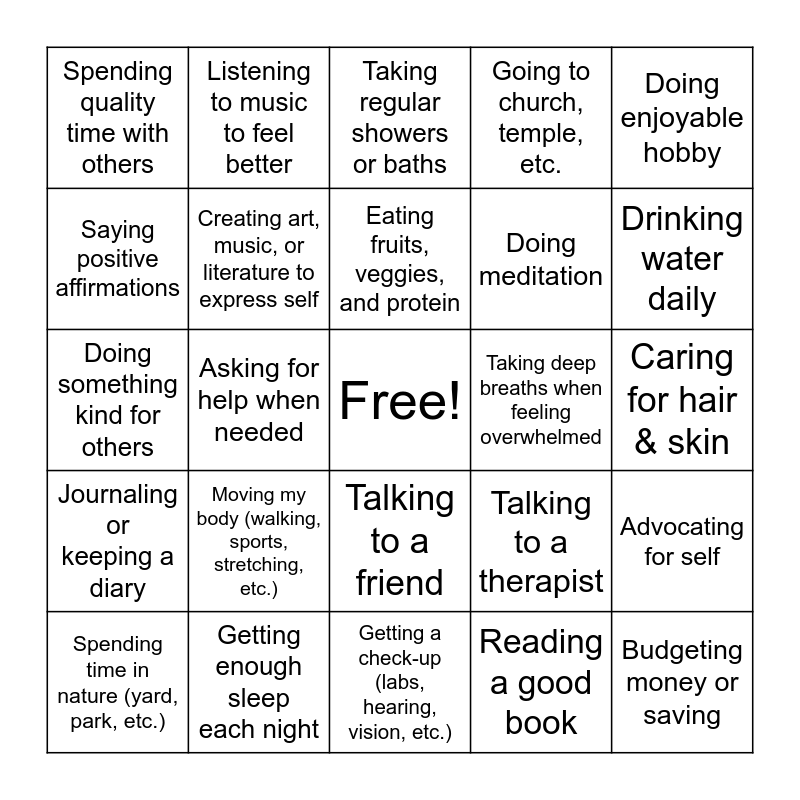 This bingo card has a free space and 24 words: Moving my body (walking, sports, stretching, etc.), Getting enough sleep each night, Eating fruits, veggies, and protein, Spending time in nature (yard, park, etc.), Doing enjoyable hobby, Spending quality time with others, Saying positive affirmations, Listening to music to feel better, Taking deep breaths when feeling overwhelmed, Talking to a friend, Doing meditation, Doing something kind for others, Talking to a therapist, Advocating for self, Creating art, music, or literature to express self, Reading a good book, Caring for hair & skin, Taking regular showers or baths, Drinking water daily, Asking for help when needed, Budgeting money or saving, Journaling or keeping a diary, Going to church, temple, etc. and Getting a check-up (labs, hearing, vision, etc.).
