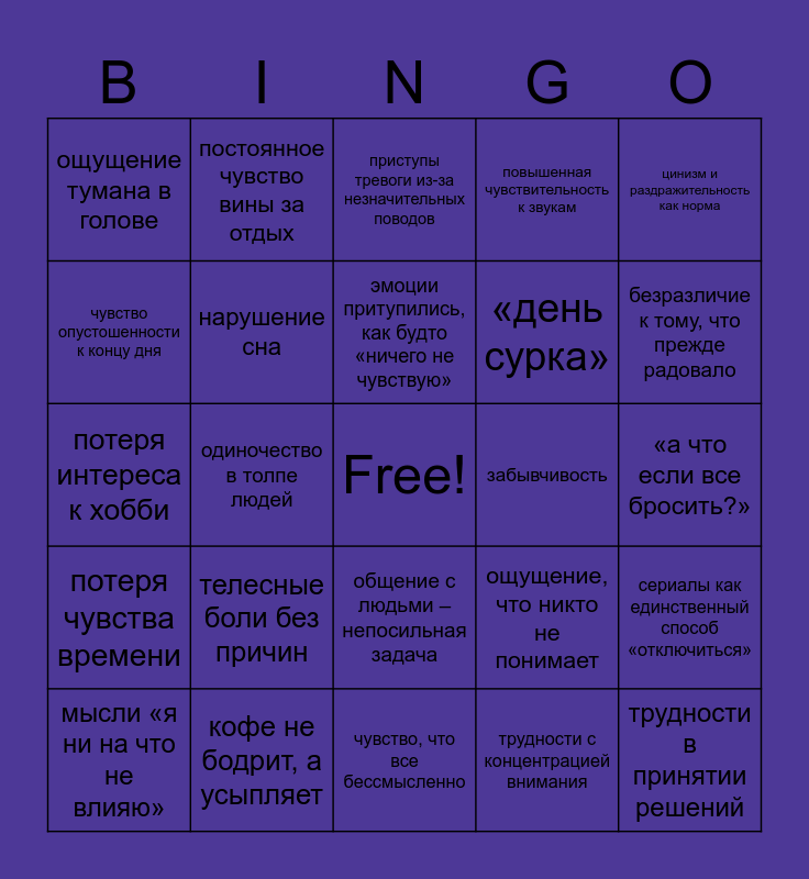 This bingo card has a free space and 24 words: телесные боли без причин, кофе не бодрит, а усыпляет, эмоции притупились, как будто «ничего не чувствую», мысли «я ни на что не влияю», цинизм и раздражительность как норма, ощущение тумана в голове, чувство опустошенности к концу дня, постоянное чувство вины за отдых, забывчивость, общение с людьми – непосильная задача, «день сурка», потеря интереса к хобби, ощущение, что никто не понимает, сериалы как единственный способ «отключиться», нарушение сна, трудности с концентрацией внимания, «а что если все бросить?», приступы тревоги из-за незначительных поводов, безразличие к тому, что прежде радовало, одиночество в толпе людей, трудности в принятии решений, потеря чувства времени, повышенная чувствительность к звукам and чувство, что все бессмысленно.