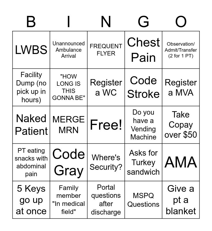 This bingo card has a free space and 24 words: Code Gray, Family member "In medical field", Register a WC, 5 Keys go up at once, Observation/ Admit/Transfer (2 for 1 PT), LWBS, Facility Dump (no pick up in hours), Unannounced Ambulance Arrival, Do you have a Vending Machine, Where's Security?, Code Stroke, Naked Patient, Asks for Turkey sandwich, AMA, "HOW LONG IS THIS GONNA BE", MSPQ Questions, Take Copay over $50, FREQUENT FLYER, Register a MVA, MERGE MRN, Give a pt a blanket, PT eating snacks with abdominal pain, Chest Pain and Portal questions after discharge.