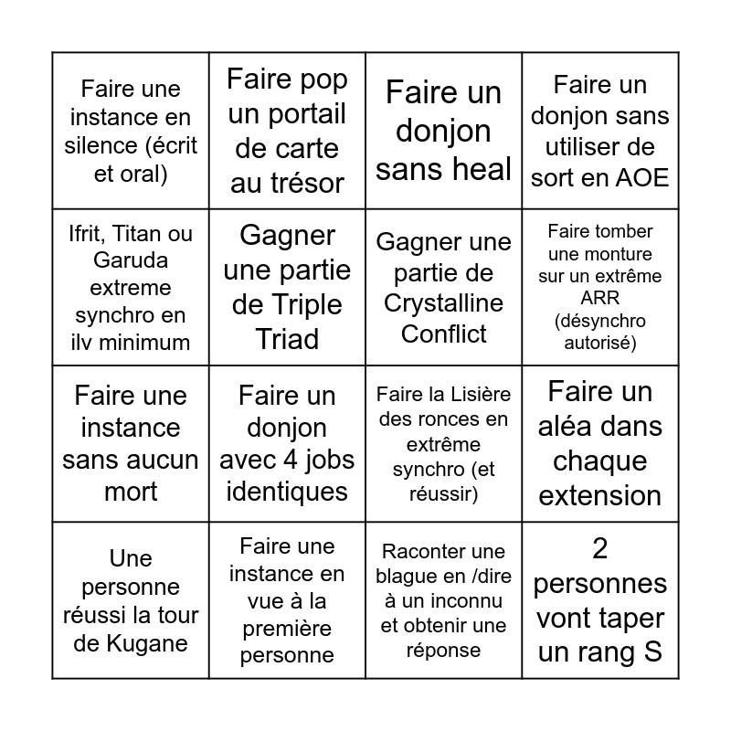 This bingo card has 16 words: Faire une instance en vue à la première personne, Faire un aléa dans chaque extension, Faire un donjon sans heal, Faire une instance en silence (écrit et oral), Faire une instance sans aucun mort, Faire pop un portail de carte au trésor, Faire la Lisière des ronces en extrême synchro (et réussir), Raconter une blague en /dire à un inconnu et obtenir une réponse, Ifrit, Titan ou Garuda extreme synchro en ilv minimum, Gagner une partie de Triple Triad, Une personne réussi la tour de Kugane, Faire un donjon sans utiliser de sort en AOE, Faire un donjon avec 4 jobs identiques, Faire tomber une monture sur un extrême ARR (désynchro autorisé), Gagner une partie de Crystalline Conflict and 2 personnes vont taper un rang S.