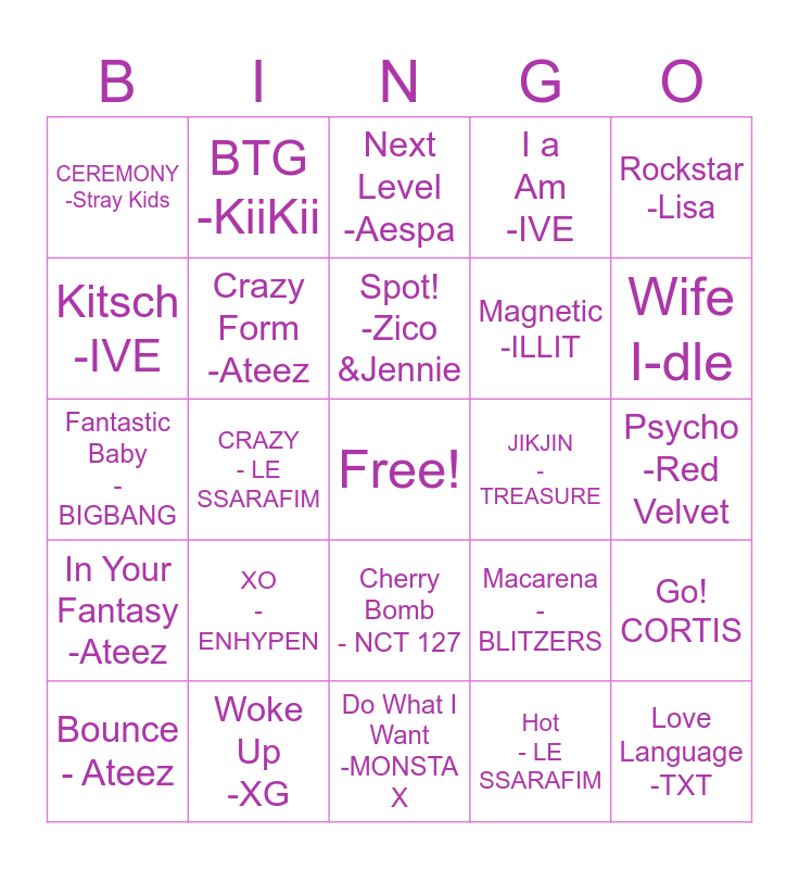 This bingo card has a free space and 44 words: MONA LISA -JHOPE, Love Language -TXT, PYTHON -GOT7, Bounce - Ateez, Sad Song -P1harmony, Hot - LE SSARAFIM, Next Level -Aespa, Cupid -FIFTY FIFTY, Rockstar -Lisa, Woke Up -XG, I a Am -IVE, JIKJIN -TREASURE, Cherry Bomb - NCT 127, XO -ENHYPEN, THUNDER -SEVENTEEN, Do What I Want -MONSTA X, SHEESH -BABYMONSTER, Fantastic Baby -BIGBANG, Fancy -Twice, Wife I-dle, BTG -KiiKii, Spaghetti - LE SSARAFIM, Born To Be -ITZY, CEREMONY -Stray Kids, Tantara -iKON, Psycho -Red Velvet, CAKE -ITZY, ICKY -CARD, Macarena -BLITZERS, In Your Fantasy -Ateez, 1&Only XLOV, Go! CORTIS, GGUM -YEONJUN, Sherlock SHINee, CRAZY - LE SSARAFIM, POP! NAYEON, That That -PSY, XXL -young possy, Spot! -Zico &Jennie, Kitsch -IVE, Magnetic -ILLIT, TT -Twice, Crazy Form -Ateez and Maniac -Stray Kids.